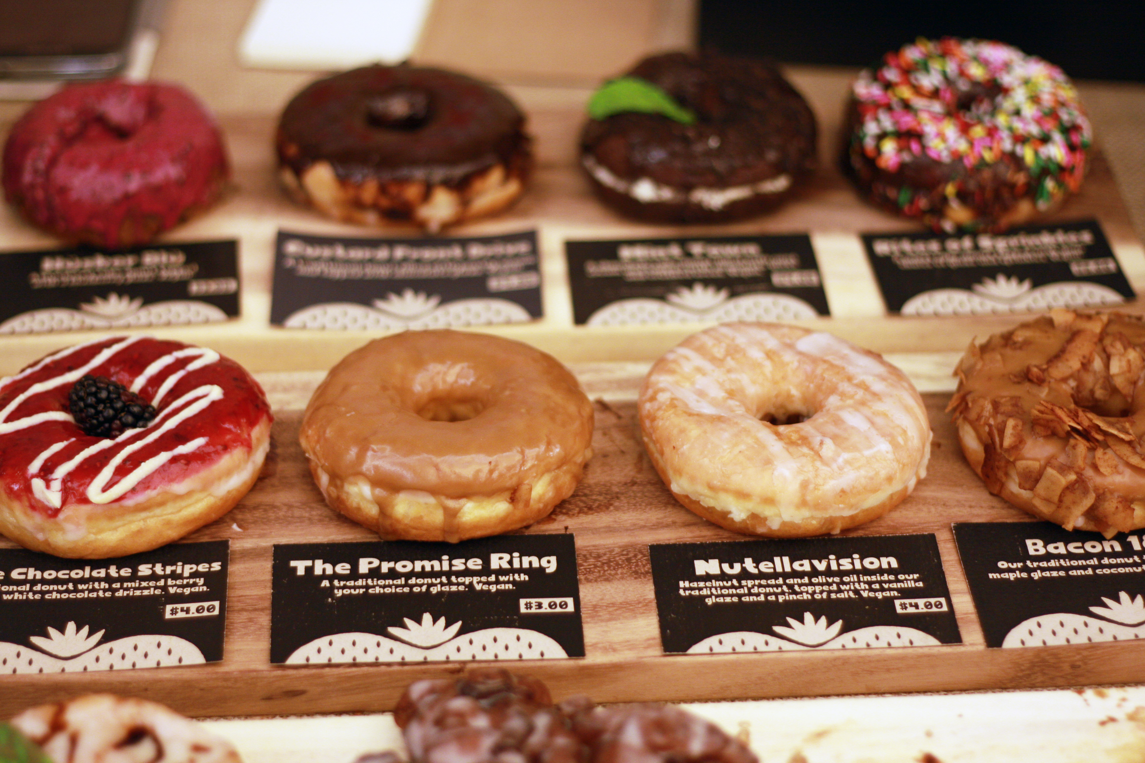 People will pay a high price for a unique creation. Your average donut is less than a dollar. Donut Friend’s offerings range from $2.50 to $5.00 for menu items, and the sky’s the limit when it comes crafting your own custom creations. Customers happily pay $5.00 for a SRIRACHOSIN (a traditional donut stuffed with peanut butter, strawberry jam, regular or coconut bacon, and a dash of sriracha sauce).